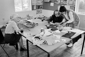 1984. Eve Hostettler (right) overseeing the making of the first Island History wall-hanging with Ada Price (on left) and Nell Humphries
