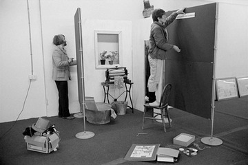 1984. Island History Project workers Bernard Canavan and Eve Hostettler preparing exhibitions for an Open Day