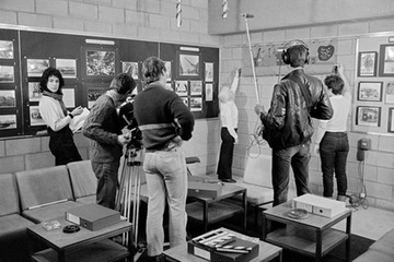 1984. BBC2 'Timewatch' filming at an Island History Project (later Trust) Open Day in the Lansbury Room at the George Green’s Centre: unrolling a wall-hanging, on left, Ada Price