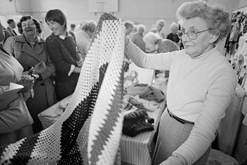 Visiting craft stalls: in background, laughing together, Eve Hostettler and Bessie Conway