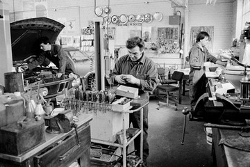 Fleet vehicle maintenance workshop in Manilla Street: Kevin Sach under the bonnet of a BMW, Frank Sach in the foreground and John Harvey