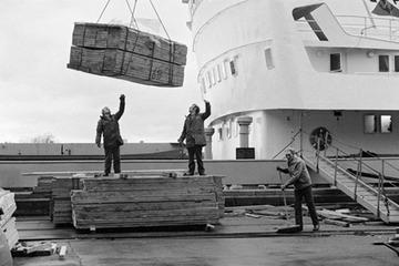 Unloading timber onto the wharf