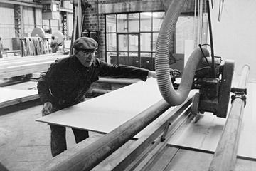 Harry Henman cutting chipboard to size on a panel saw in the saw mill