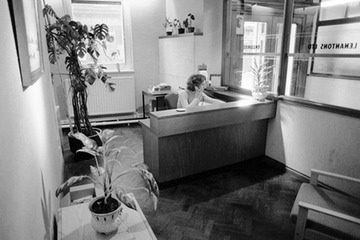 Linda Collett at the office reception desk
