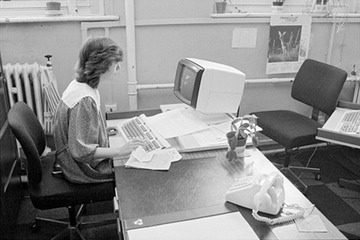 Office worker Jackie Wade at a computer