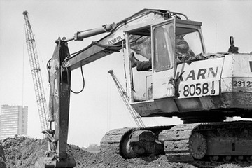 Digger at work, with a tower block on the Pepys Estate in Deptford in the left background