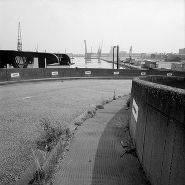 1982. View from the ramp to the upper storey of ‘Shed 19’ (on the south side of South Quay) looking south along Millwall Inner Dock Basin with McDougall’s Flour Mill grain silos in the distance. In the middle foreground (left) is part of the swing road bridge which crossed the cutting between the Millwall and West India Docks. Beyond that, the 'glass' footbridge which crossed Millwall Inner Dock connecting Tiller Road and Glengall Grove