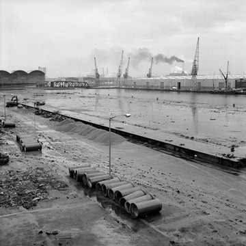 1982. View across the inner basin from the 'glass' footbridge, looking north-east towards the Olsen Sheds and, in the distance, Blackwall Power Station