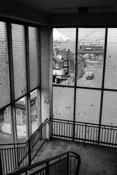 1982. Stairwell at the Tiller Road end of the 'glass' footbridge which crossed over the inner basin to Glengall Grove