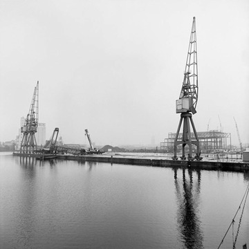 1984. View looking south-west across the inner basin, with the construction of the ‘Daily Telegraph’ print works underway in the background (right) and McDougall’s Flour Mill grain silos behind the cranes (left)