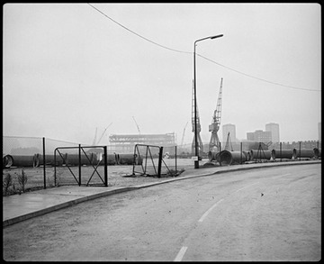 1984. View from the east side of the inner basin looking west towards the ‘Daily Telegraph’ printing works under construction on the other side of the dock