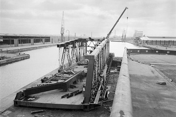1984. View from the road ramp leading to ‘Shed 19’ on South-West India Quay of workmen removing the swing bridge at the northern entrance to the inner basin