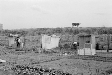 1985. Mudchute allotments inside the entrance in Pier Street
