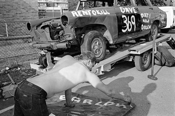 1984. Preparing old cars for 'banger' racing on derelict land by the Pier Street entrance to Mudchute Park and Farm