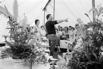 1985. Rob Yeomans, the vicar of Christ Church, auctioning off home produce. On left, helpers Eve Hostettler and Joy Perez