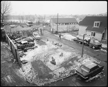 1986. View from Urmston House of the Pier Street entrance to the park and farm, showing “banger racing” cars and early Mudchute farm offices and classroom building, with banks and fields in the background