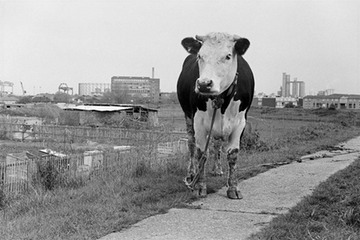 1984. Tethered cow on the path on the west side of the Mudchute Allotments
