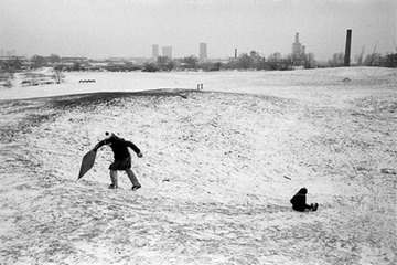 1985. Sledging in the snow in the amphitheatre, looking south-west