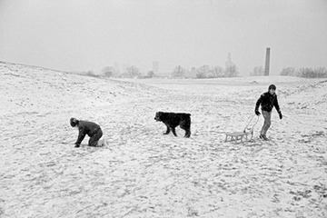 1985. Sledging in the snow in the amphitheatre, looking south-west