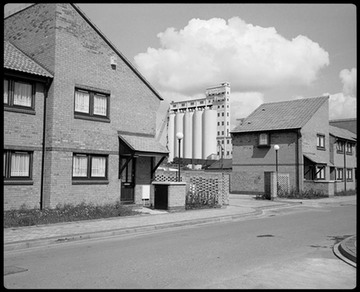 1985. Clipper’s Quay housing estate on the south side of the former Millwall Dock outer basin. Demolition of the McDougall's Flour Mill grain silos has just begun