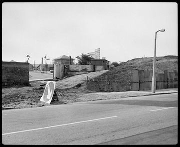 1985. View of Clipper’s Quay housing estate from East Ferry Road. Demolition of the McDougall's Flour Mill grain silos has just begun