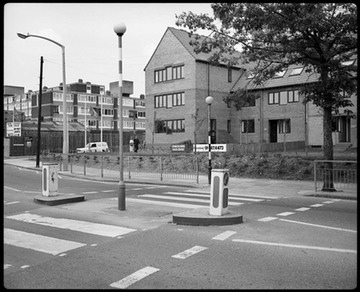 1985. View from the crossing in Manchester Road outside Cubitt Town School of part of London Yard (right) and part of the Samuda Estate (left)