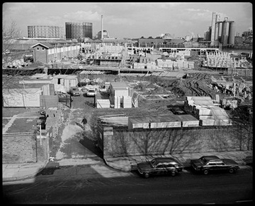1986. View from Farnworth House, Manchester Road, of the Compass Point housing development under construction., looking east. In the foreground is what is now Blythe Close