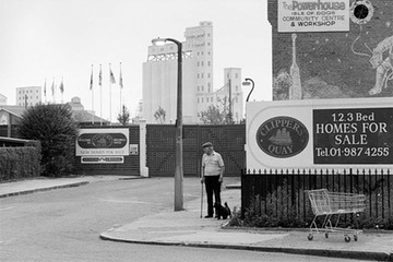 1984. East Ferry Road entrance to the new Clippers Quay housing estate built on the south side of Millwall Dock outer basin, looking north towards the McDougall's Flour Mill grain silos, later demolished