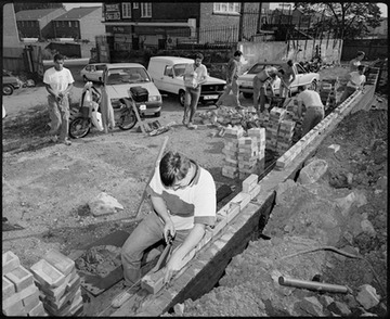 1987. Workers, including Garry Cain (front), Andrew Mansfield, Andy ?, Billy Bohle and Paul Wright, on the Great Eastern self-build site at Maconochies Wharf, Westferry Road