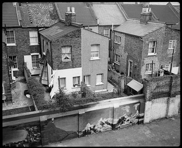 1985. Backyards of terraced houses on the south side of Mellish Street, looking north