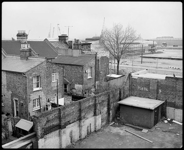 1985. Backyards of terraced houses on the south side of Mellish Street, looking north-east towards Millwall Dock inner basin