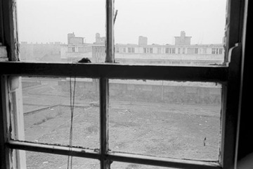 1985. Cubitt House, Roffey Street, a rundown public housing block with evidence of structural damage caused by pile driving nearby in the East Ferry Road area. This view through the window is looking south to Roffey House, a block similar to Cubitt House