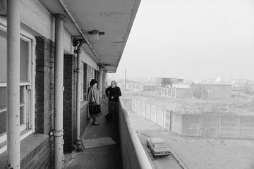 1985. Pat Gibbs, a Welfare Rights Campaign and social worker talking to a resident on the balcony of Cubbit House, Roffey Street. Pile-driving is taking place close by and the building has no stress-factor built in
