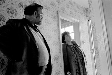 1985. Flat 32, Cubitt House, Roffey Street, badly affected by damp. Welfare Rights worker, Pat Gibbs, talking to the new tenant who has just moved in