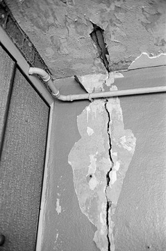 1985. Flat  29, Cubitt House, Roffey Street,  with evidence of structural damage caused by pile driving nearby in the East Ferry Road area