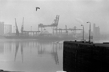 1985. View from the ‘Blue Bridge’ at the eastern entrance to West India Docks, looking east towards the Victoria Deep Terminal on the North Greenwich peninsula
