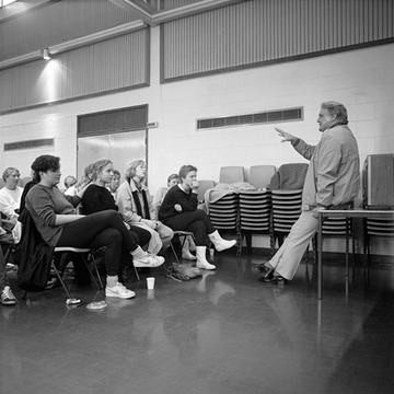 1984. Ted Johns, community activist and former Councillor, of the Association of Island Communities, talking to local secondary school children at George Green School about redevelopment issues