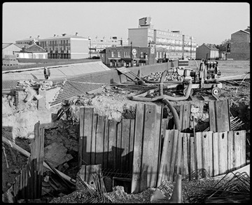 04 December 1984. Sewer works in what would become Crossharbour, under the DLR station, looking south-east towards ‘The George’ pub in East Ferry Road