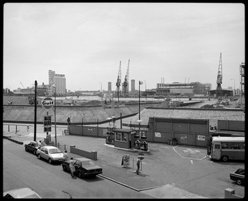 1985. View from John McDonald House in East Ferry Road, looking south-west across Limeharbour towards Millwall Docks