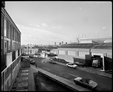 January 1986. View from John McDonald House in East Ferry Road, looking south-west across Limeharbour towards Millwall Docks
