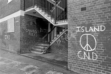 05 November 1984. Graffiti on stairs to maisonettes above shops in Manchester Road at the corner of Glengarnock Avenue