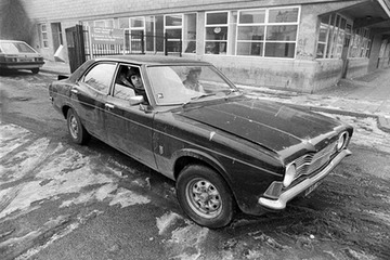 March 1985. Youths with car in the snow outside the George Green’s Youth Centre, Manchester Road