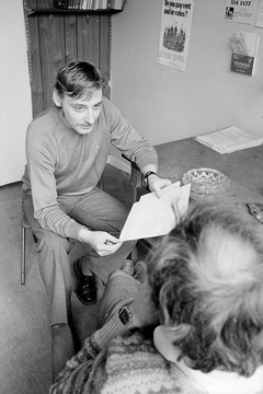 St. Edmund’s Welfare Rights Campaign: Jim Macready and Mike Feaney (closest to camera) simulate a client interview at Island House