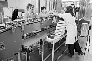 Bottling and packing ‘Golden Syrup’: June Arrowsmith, Sandra and Sue Barns. June lived in Alpha Grove