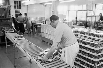 Bottling and packing ‘Golden Syrup’: Ernie, who lived in Tiller Road, with, in the background, June Arrowsmith and, on the right, Penny Bray