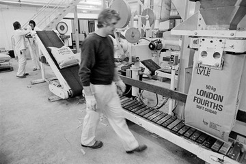 Machine for filling bags with soft sugar: Martin Cannon and, in the background, Mickey Hatter and Paul Marlborough