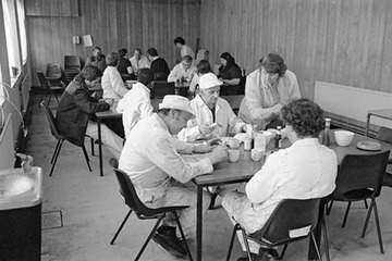Staff canteen: Annie Tingay serving and beyond her are Penny Bray and Margaret Goddard clearing tables. Left front is Alan Lockwood