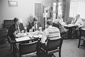 Office staff canteen: facing the camera, second from left, is Jerry Peters, the manager