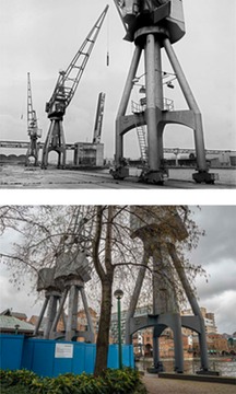 Cranes on the west side of Millwall Inner Dock, looking north-east towards the Glengall ('Glass')