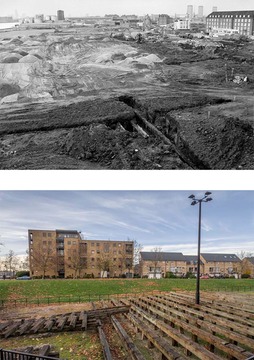 Mast House Terrace site, looking west from Burrell's Wharf. It was during the site clearance in the early 1980s that the timber slipway thought to be associated with the building of Brunels' ship 'Great Eastern' were discovered